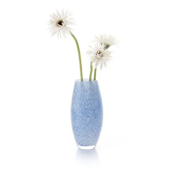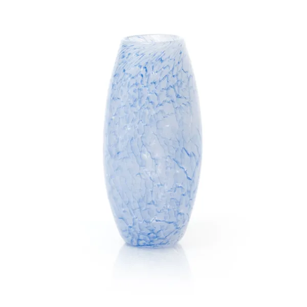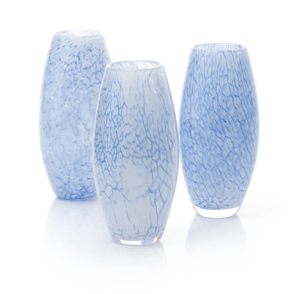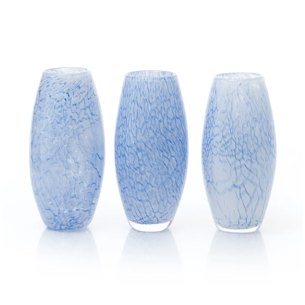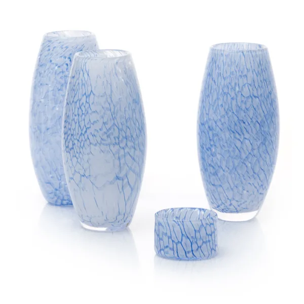 This handblown bottle features delicate blue crackle patterns, creating a striking, organic design reminiscent of flowing water or cracked ceramic glaze. Light and airy in appearance yet sturdy in hand, each piece offers a perfect balance of elegance and practicality. The bottle can be used individually as a vase and can also pair beautifully with the Blue Crackle drinking set.