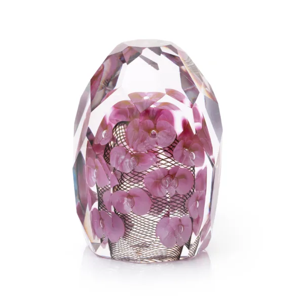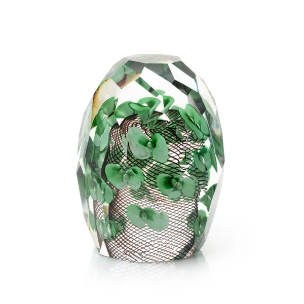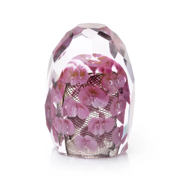 Encased in a sparkling, crystal-clear form lies a miniature world: fluttering blossoms are suspended in radiant glass, amidst a delicate woven web reminiscent of a butterfly net. Every angle reveals new patterns of light and depth, transforming this sculptural object into a living kaleidoscope.