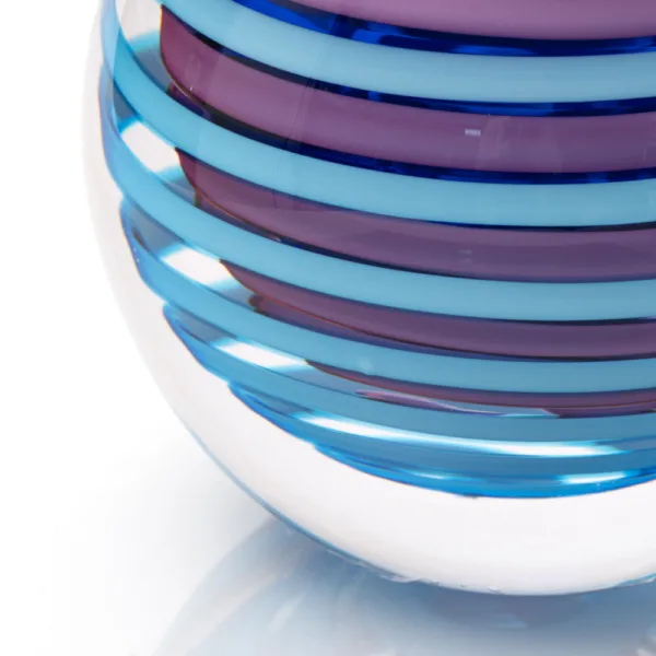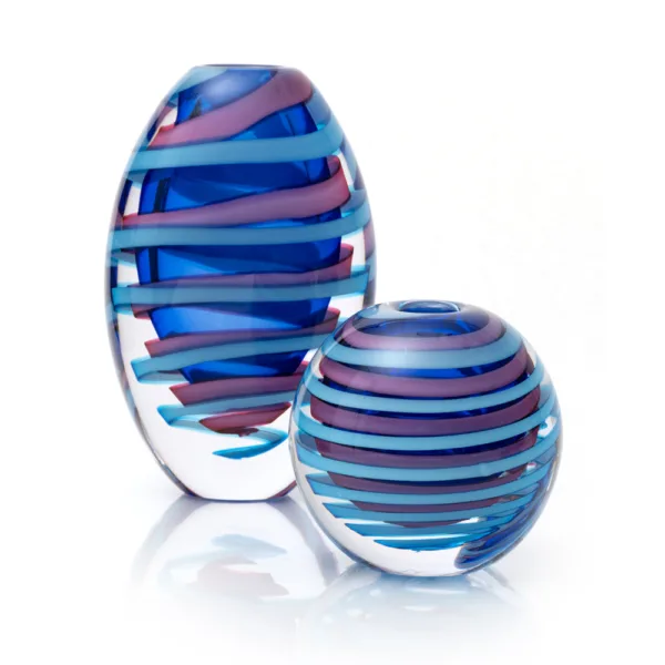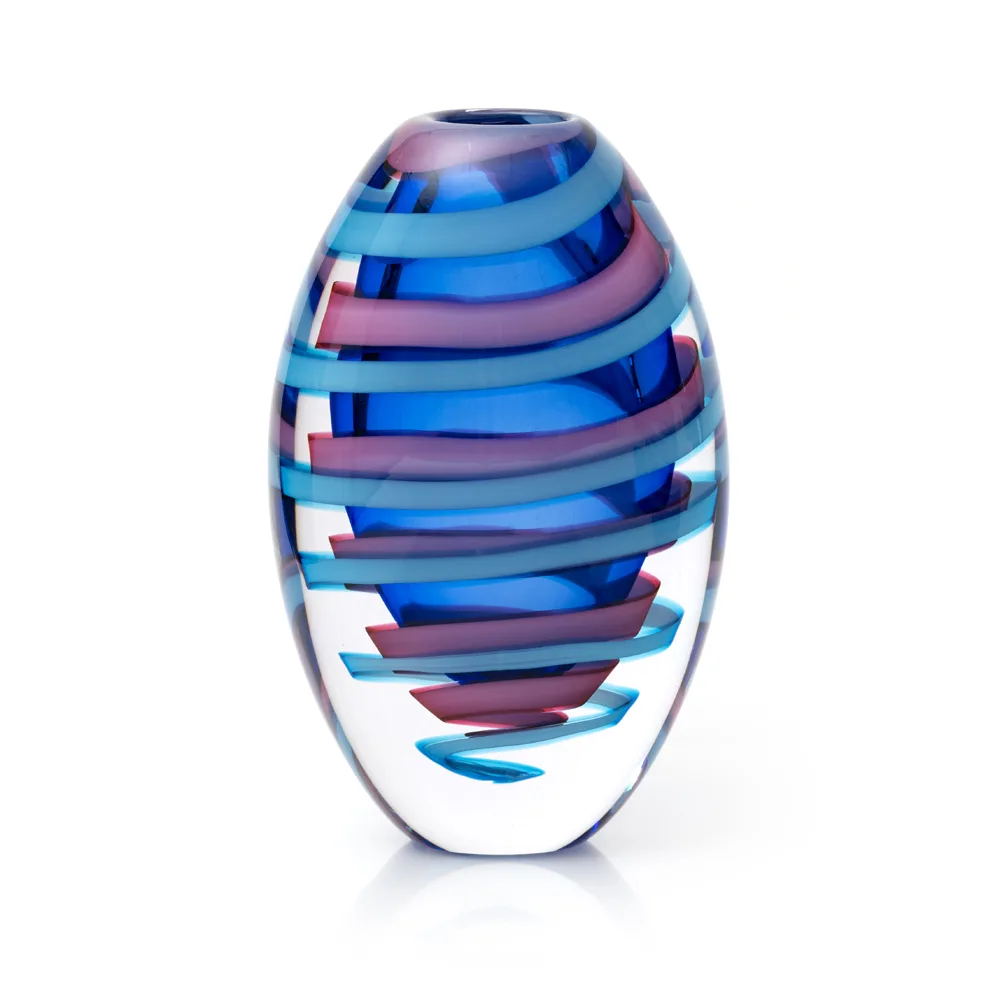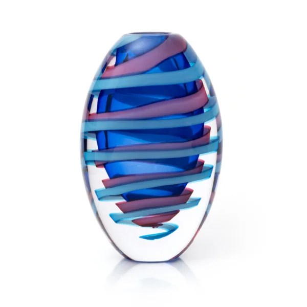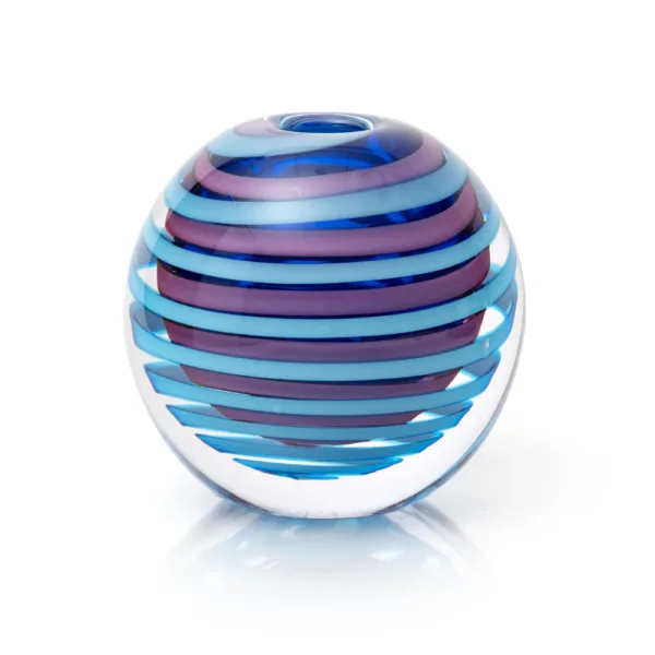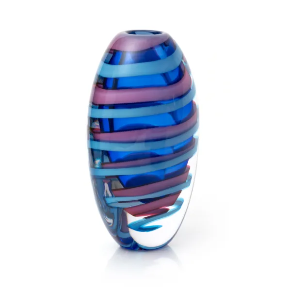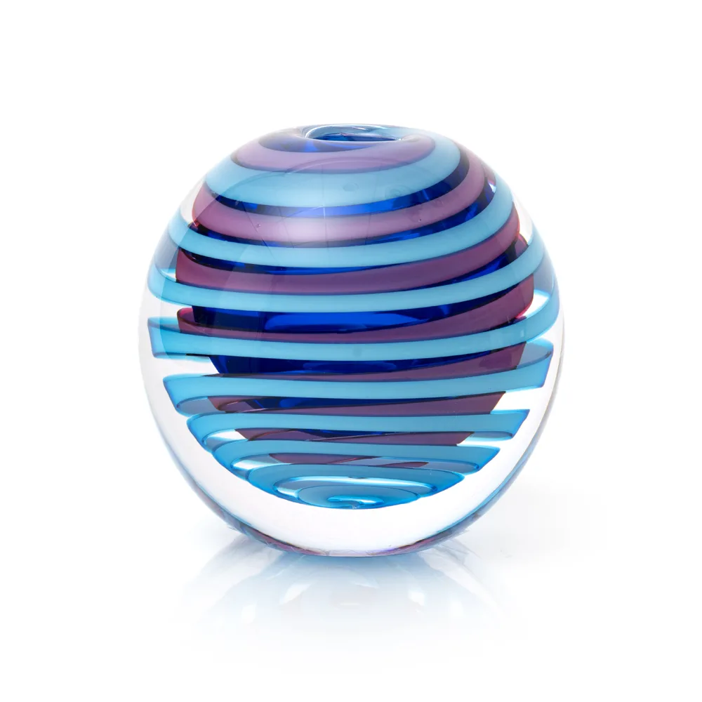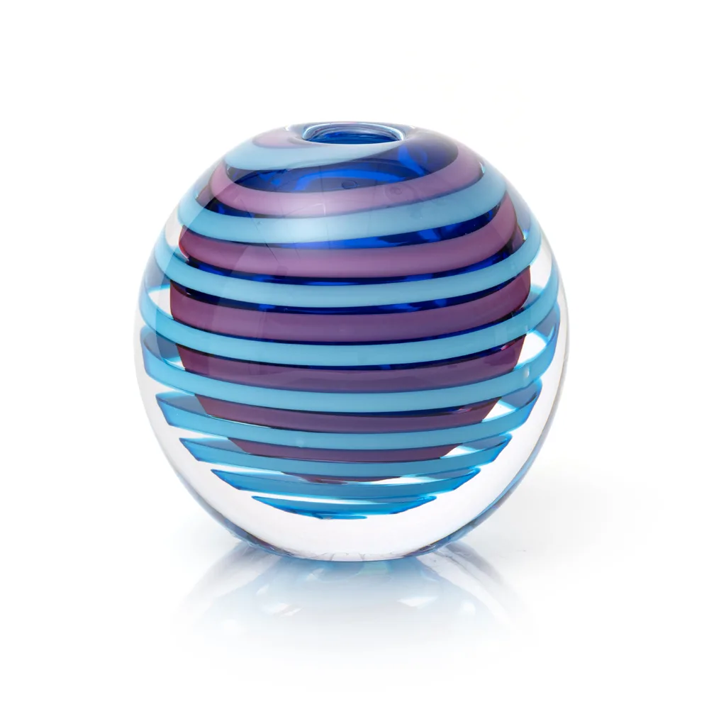 Playful and bold, Candy Swirl bursts with vibrant energy. Vivid ribbons of pink and aqua spiral around a rich cobalt blue core, a sweet treat for the eyes. The rounded form and joyful color palette makes this a perfect statement piece—modern, whimsical, and irresistibly fun.