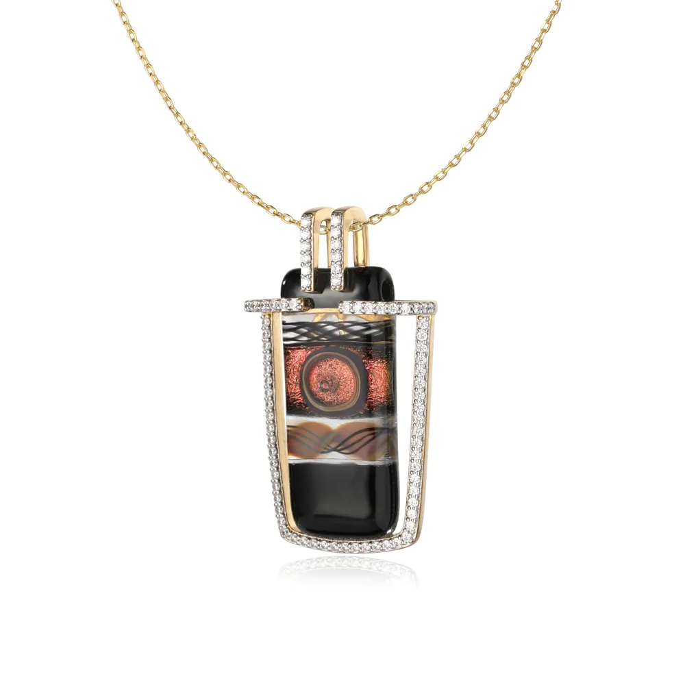 This one-of-a-kind pendant from Mareve features a handcrafted Art Stone with bold layers and waves of inky black, tan, and iridescent orange. As you gaze into the depths of the stone you’ll discover an intricate universe of textures, patterns, and colors that shift with the light.