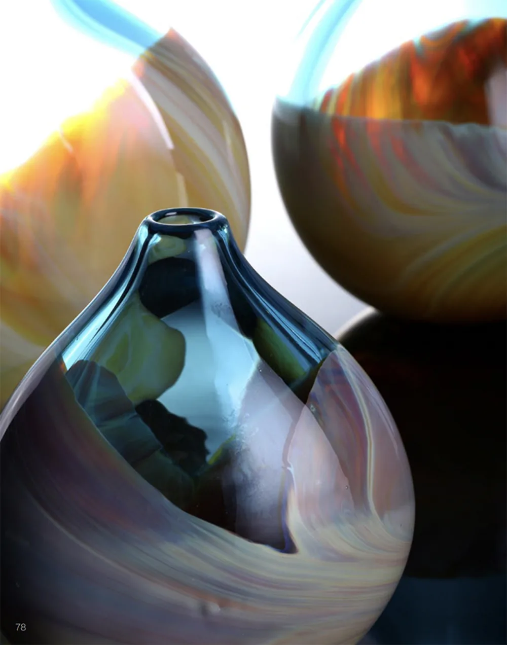 This piece evokes an almost prehistoric energy: like a glacier cutting through rock, or ice cold water over a seabed, the clear blue glass is pristine against the smooth, stridated layers of earthy tan and amber.