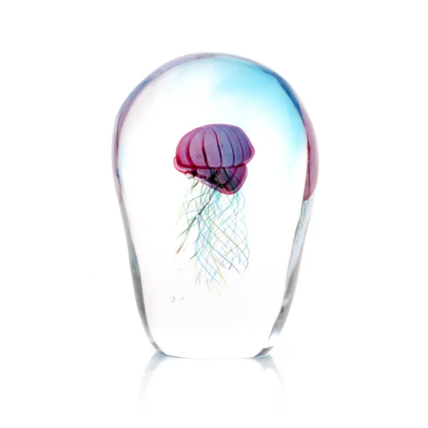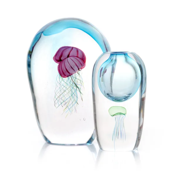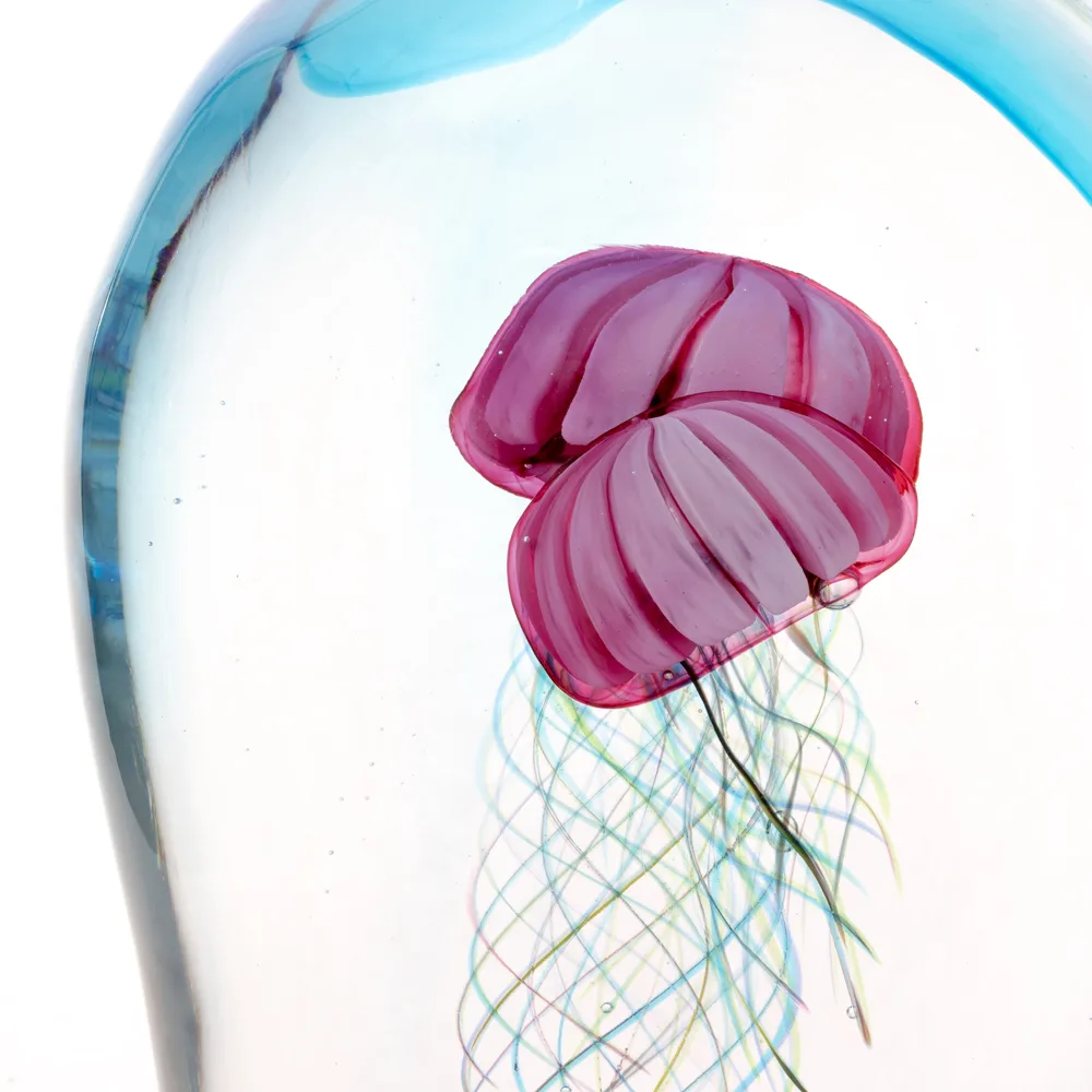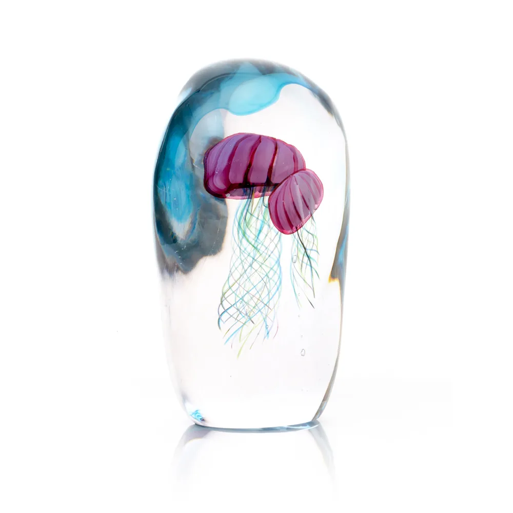 Ethereal and luminous, Quiet Sea captures the quiet grace of jellyfish drifting through crystalline waters. Suspended within handblown glass, each form floats delicately, their tendrils trailing like whispers. Soft blues and seafoam greens evoke the stillness of the deep, making these sculptural vessels both meditative and mesmerizing, a tribute to the serenity and wonder of the underwater world.