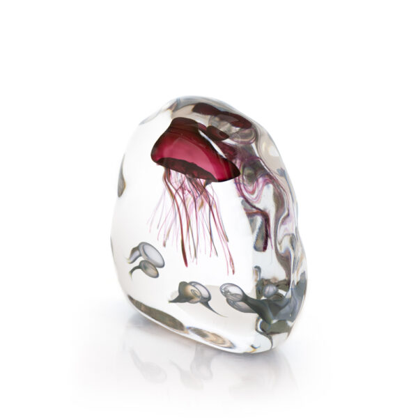 Like an aquatic looking glass, the delicate tendrils of a colorful jellyfish float gently in a crystal clear world.