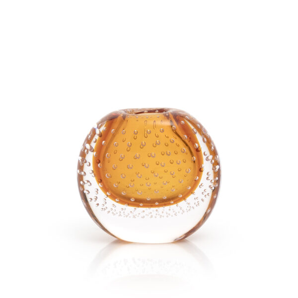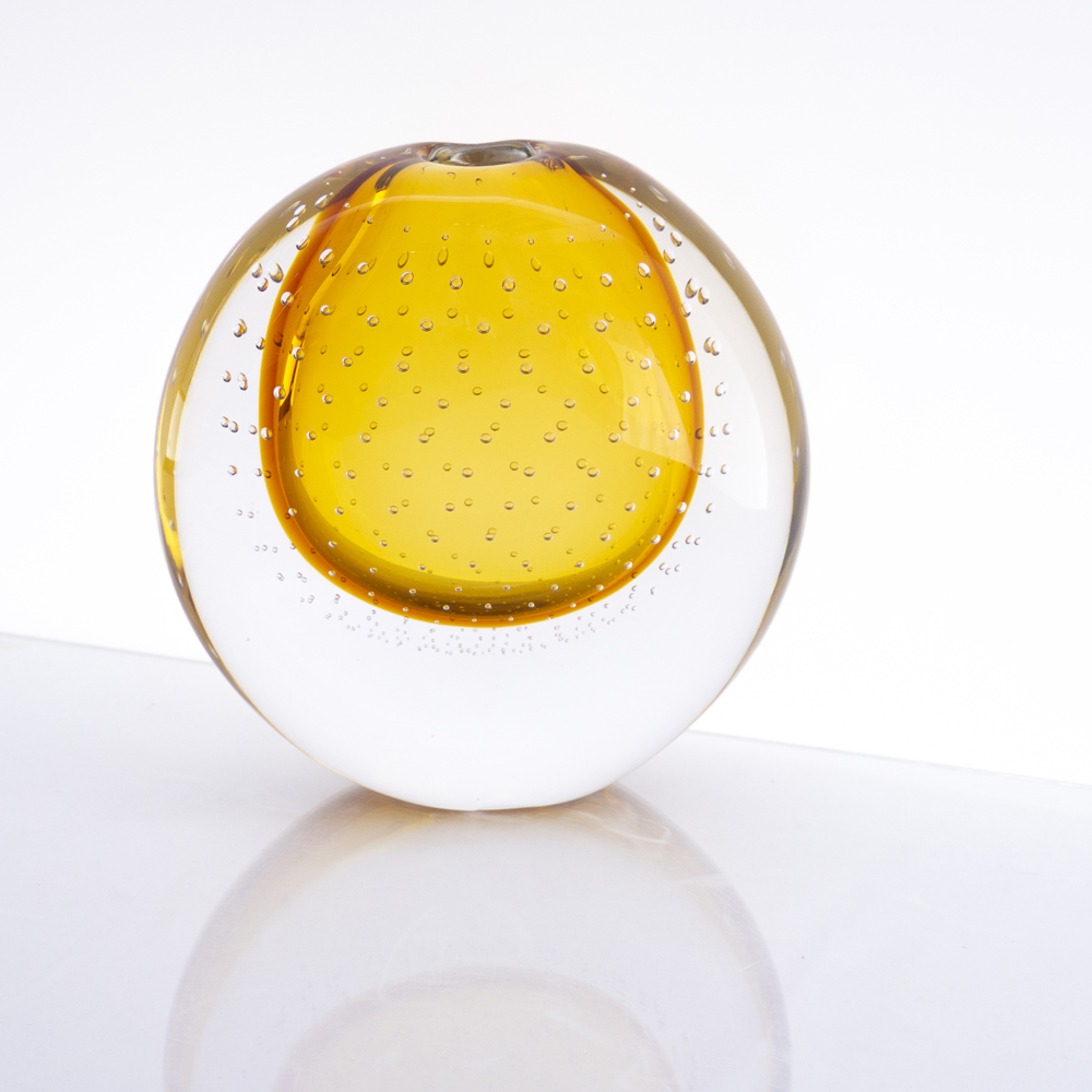 Delicate bubbles and a richly colored droplet are encased in a crystal-clear orb – a captivating and sculptural centerpiece.
